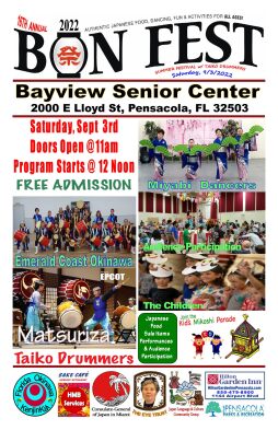 The 16th Annual BonFest Pensacola is sponsored by the Consulate-General of Japan in Miami, HMB Services, Sake Café Japanese Restaurant, Florida Okinawa Kenjinkai, The Eye Trust, Japan Language & Culture Community Group, Hilton Garden Inn Pensacola and Play Pensacola Parks & Recreation.