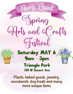 8th annual arts and craft fair May 6, 9-3 PM, at Triangle Park in Navy Point. The original fair started with just a handful of artists and craft folks and has gained a variety of vendors and shoppers each year. This spring fair will host a wide assortment of vendors including, mixed media paintings, glass art, photo jigsaws, books, plants, jewelry, dog treats, pinback buttons, pottery, baked goods, barbecue food truck, ice cream and more. The non profit Joy Committee will be there to provide information about their dog rescue, foster program, and adoption process.