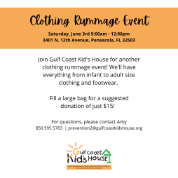 Gulf Coast Kid's House storage is overflowing so we are holding a clothing rummage event on June 3rd, just $15 fills a large bag and all donations go directly to the services we provide.