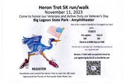 Friends of the Pensacola State Parks are holding a nature-inspired Heron Trot 5K run honoring Veterans and Active-Duty Military at Big Lagoon State Park on November 11th. The race is open to all.