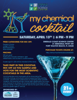 Take part in this cocktail mix off as you sample and vote for the most scientific cocktails in the area. Local bartenders and mixologists will be showcasing the chemistry, biology, and physics behind preparing these exciting cocktails...expand your vodka-bulary by sampling these scientific creations. The evening will also include light refreshments, live music, and chances to win prizes. All proceeds benefit the Emerald Coast Science Center, a 501(c)3 nonprofit. Get into the spirit at this amazing event for guests ages 21 and up.