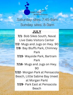 Ocean Hour volunteers meet to clean up debris and trash from local waterways and beaches. Current sign in time is 7:45 AM and cleanup is from 8:00 AM to 9:00 AM. All ages are welcome. All cleanup supplies are provided. Please wear appropriate footwear and bring your own refillable water bottle and sun protection.