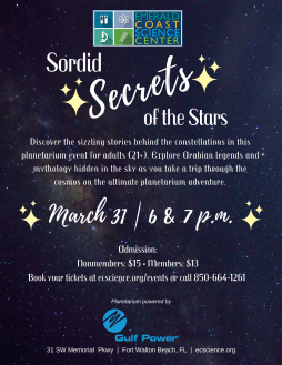 Shows begin at 6 and 7 pm and last approximately 45 minutes. Seating is limited and very popular. We encourage purchasing your tickets in advance, as this is a first come, first served event. Please call 850-664-1261, stop by the Science Center, or use our online ticketing option to purchase your tickets.