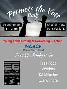 The Okaloosa County Branch NAACP and several fraternities, sororities, masonic lodges, and other civic groups are hosting a "Promote The Vote" Rally in the Park to encourage folks to register to vote in the upcoming election. Candidates from around the state as well as locally have been invited to attend. Free food, music and fun will be provided