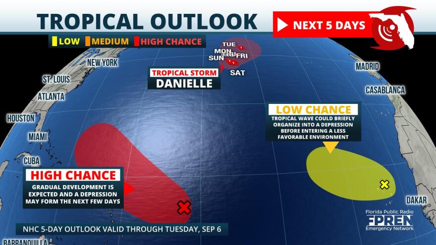In the Atlantic, Tropical Storm Danielle formed this morning and could become a hurricane by the end of the week. This system is intensifying over the subtropics, but its movement is very slow and not concerning.
