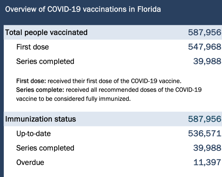 Accoridng to FDOH's vaccination report, 587,956 people have received their first dose of the COVID-19 vaccine. Read more here.